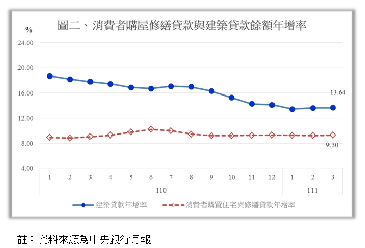 台灣房屋集團趨勢中心協理江怡慧表示,以房市供給面來看,台灣經濟研究院3月份公布營建業營業氣候測驗點為105.34點,較上月106.01點下跌0.67點,呈現連續第二個月下滑走勢。根據中央銀行3月份統計數據,象徵建商推案信心的建築貸款餘額為288.57百億元,續創歷史新高,較去年同期提高13.64%,但相較於去年成長幅度,建築貸款年增率增幅已明顯趨緩(如圖二),主要受到央行針對土地限貸與嚴格控管成數等相關政策、營建成本居高不下等因素影響,使得建商推案態度轉趨審慎。