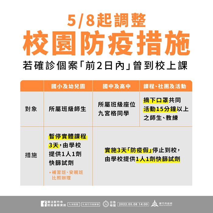市府指出,竹市目前有37校因確診持續停課或停班,昨(7)日疫情指揮中心調整校園暫停全校實體課程標準,改以確診個案為核心。民眾欲關心本市各級學校、補習班、幼兒園暫停實體課程(停課)訊息,與6至11歲疫苗施打相關資訊,皆可上「新竹市教育網」( https://www.hc.edu.tw ) 查詢。