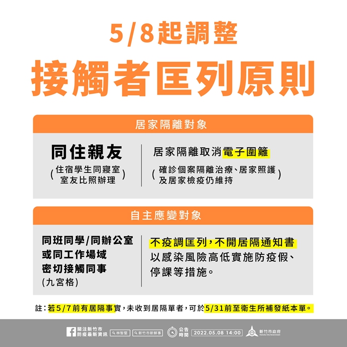 因應昨(7)日疫情指揮中心宣布,調整密切接觸者匡列以同住家親友為原則,職場及學校改採自主應變。部分民眾隔離後尚未收到居隔通知書,關心是否不會再收到通知書,衛生局表示,今日新制上路前若有居隔事實,衛生局仍會開立居家隔離通知單,未收到居隔單者,請於5月31日前至衛生所補發紙本單。