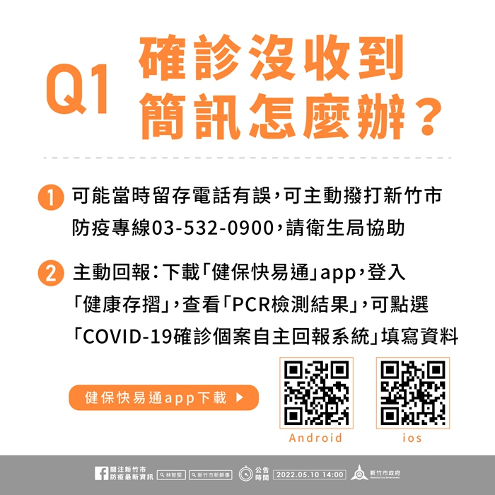 另,新竹市除既有社區篩檢站週一至五持續提供服務,增設國軍醫院及馬偕醫院急診外PCR採檢站,國軍醫院服務時間為上午09-12時、馬偕醫院下午13-16時,分流篩檢人潮。衛生局提醒民眾,務必持快篩陽性檢體方可至醫院或診所採檢,若未持快篩陽性檢體民眾,則由醫師評估是否有篩檢需求,並另行收費。