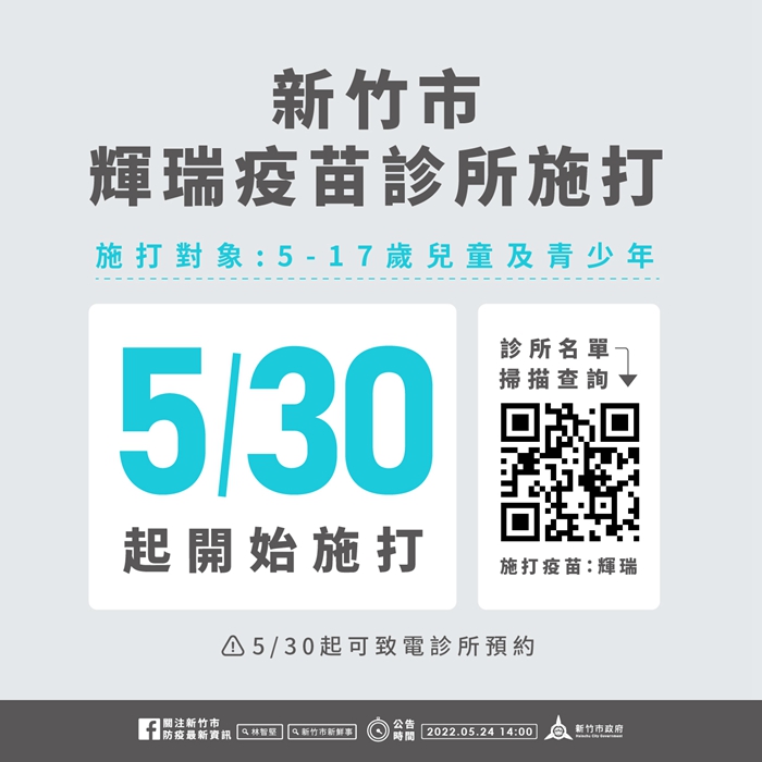 市府宣布,近日許多家長關心5-17歲輝瑞疫苗施打規劃,本市預計自本周四(26日)啟動校園巡迴施打計畫,並自下周一(30日)加開診所提供5-17歲兒童及青少年輝瑞疫苗施打管道,同時維持部分診所提供6-11歲莫德納疫苗施打服務(https://reurl.cc/yrDrbD),家長可依需求於各診所開診時段預約施打,如有疑問,請洽03-5320900諮詢。
