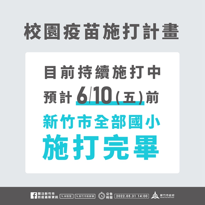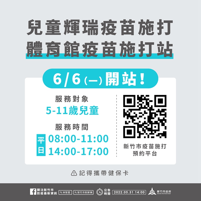 市府表示,新竹市5-11歲兒童輝瑞疫苗本週再到貨8,800劑,本市大型疫苗施打站自下周一(6月6日)起將停止中正市場施打站,轉在體育館施打站(新竹市公園路295號)提供5-11歲兒童輝瑞疫苗施打服務,設站時間為周一至周五08:00至11:00,下午14:00至17:00,請有需要之家長透過線上預約(https://vax.hccg.gov.tw/ )為孩子安排施打。今(31)日晚間七點將開放6月6日施打時段預約,6月1日零點起開放7日施打時段,2日零點起開放8日,以此類推。