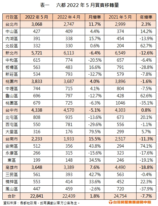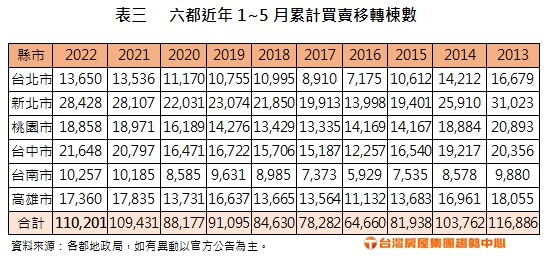 六都5月買賣移轉棟數揭曉!其中台北3,068棟,月增11.7%,年增2.3%;新北5,721棟,月減6.4%,年減12.6%;桃園3,833棟,月增4%,年減1.6%;台中4,338棟,月減5.1%,年增0.8%;台南2,233棟,月增15.5%,年減11.3%;高雄3,648棟,月增7.6%,年減18.8%;六都5月合計共22,841棟,月增1.8%,年減7.7%;累計前五個月達11萬棟,比去年同期微增0.7%,為近9年新高。