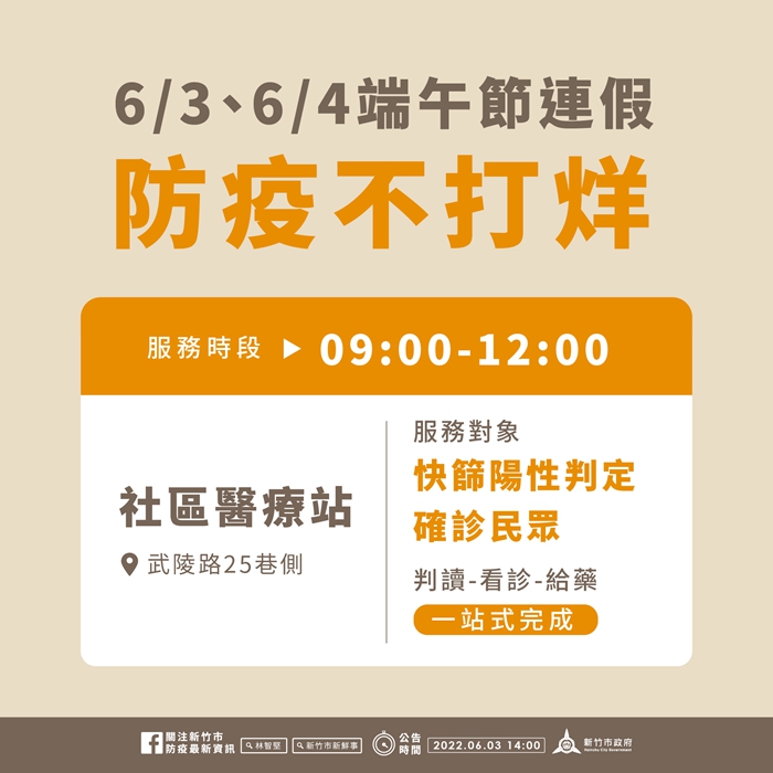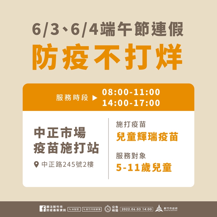 市府表示,端午連假期間中正市場疫苗施打站(中正路245號2樓)及社區醫療站(武陵路25巷側)今明兩天(6月3日及4日)仍持續提供服務。中正市場施打站服務時間為上午08:00至11:00、下午14:00至17:00,提供5-11歲兒童輝瑞疫苗施打服務;社區醫療站服務時間為上午09:00至12:00,提供快篩陽性者現場確診、診療及領藥一站式服務,請有需要的民眾自行前往利用。