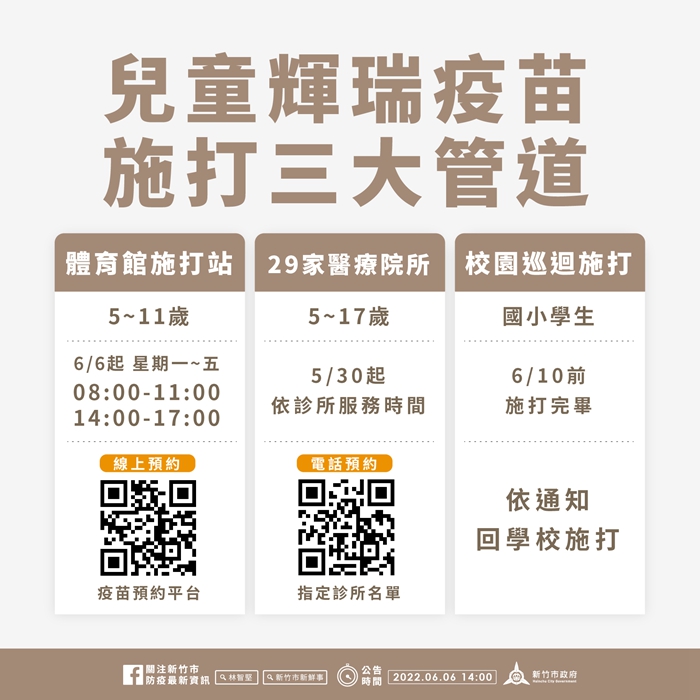 衛生局指出,兒童輝瑞疫苗施打3大管道,除大型施打站之外,竹市國小校園巡迴施打將於6月10日前施打完畢,學童依通知回學校接種疫苗,或可於本市29家指定醫療院所(https://reurl.cc/yrDrbD)預約接種疫苗。