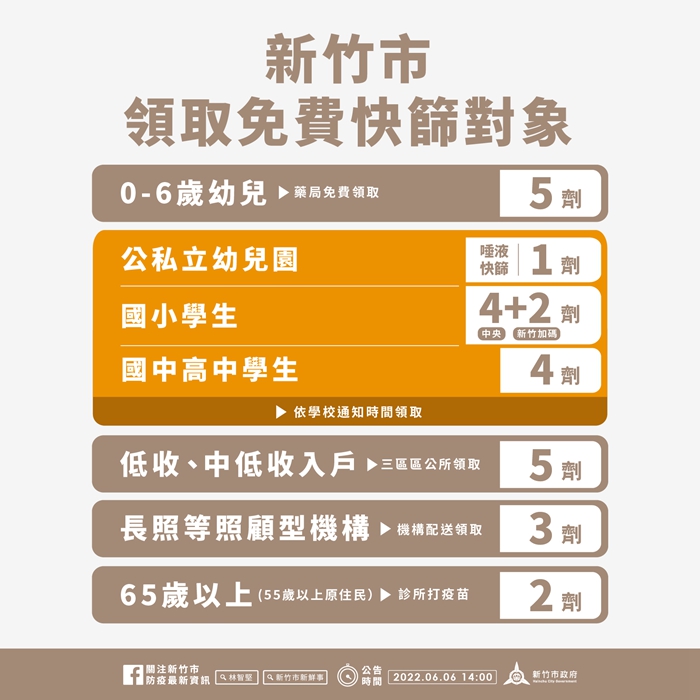 衛生局說明,今日起幼兒鼻咽快篩試劑免費領取,年齡擴大至2015年9月2日(含)以後出生之幼兒,6月30日前,家長可持幼兒健保卡至竹市實名制健保特約藥局(https://reurl.cc/Kb9zln)免費領取5劑快篩試劑,依身分證尾數單雙號分流領取;另針對國小學童,除可領取中央發放4劑家用抗原快篩試劑之外,竹市再加碼2劑。