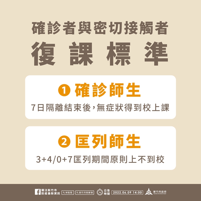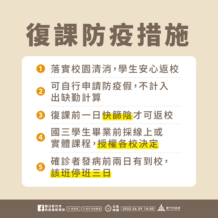 市府指出,本市高中、國中小、公立幼兒園學生自6月13日起恢復實體課程,復課後各校相關防疫措施,仍請依教育部「校園因應『嚴重特殊傳染性肺炎』(COVID-19)疫情調整授課方式實施標準」辦理。