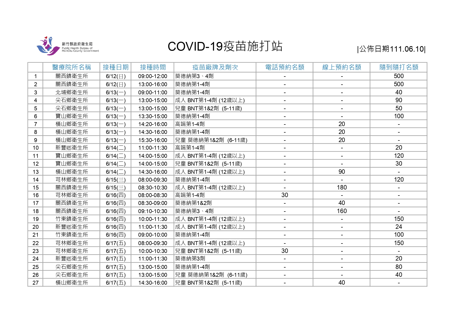新竹縣各合約院所、衛生所持續提供新冠肺炎各廠牌疫苗接種服務,本月11日起至17日規劃多所衛生所預約或隨到隨打接種,請鄉親多加利用。詳細資訊請參考圖卡,也可查詢竹縣疫苗地圖,並利用新竹縣疫苗預約入口網預約。