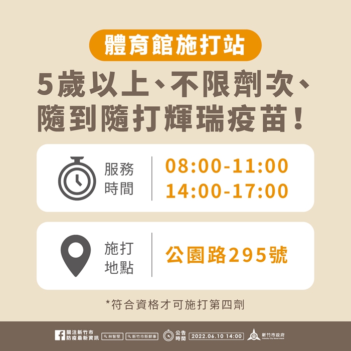 市府表示,為提供民眾便利疫苗施打服務,體育館施打站(公園路295號),下周持續針對符合中央規定接種資格民眾之輝瑞疫苗施打服務,不限劑次、隨到隨打;開站時間為周一至周五08:00至11:00,下午14:00至17:00;因兒童及成人劑量不同,動線將會分流。