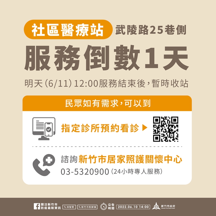 衛生局表示,本市社區醫療站(武陵路25巷側)本周六(6月11日)為服務最後一天,當天場次09:00至12:00結束後將暫時收站,民眾如有需求可洽本市基層診所預約(https://reurl.cc/KbdgN9),如尚有疑問,請洽本市居家關懷中心03-5320900諮詢(24小時專人服務)。