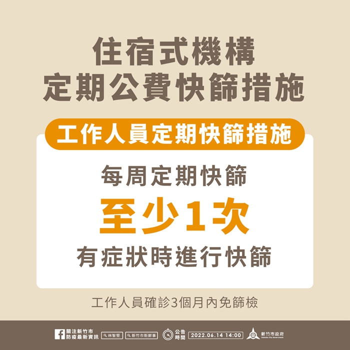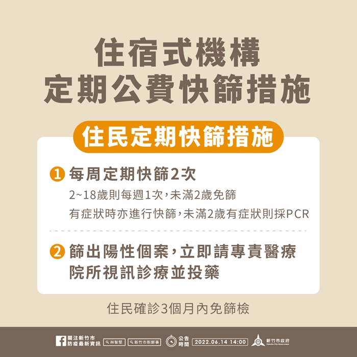市府表示,本市配合中央政策,6月中旬至7月31日止,實施住宿式機構定期公費快篩措施,機構住民每週需定期快篩2次,2至18歲則每週快篩1次,未滿2歲者免篩,若出現症狀亦進行快篩,未滿2歲則採PCR;工作人員每週定期快篩至少1次,有症狀時亦進行快篩。