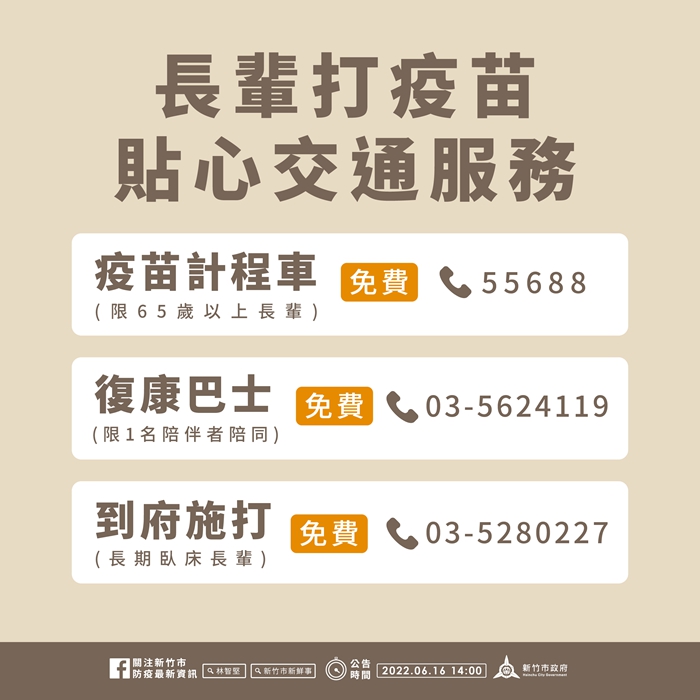 衛生局表示,3處施打站主要服務65歲以上及55歲以上原住民長輩,於第一次追加劑(第3劑)注射滿五個月後施打第二次追加劑(第4劑),若尚未完成前3劑需施打基礎劑(第1、2劑)及第一次追加劑(第3劑)者亦可到站施打,更提供三大免費貼心交通服務,疫苗計程車、復康巴士與到府施打,詳細資訊請見圖卡。