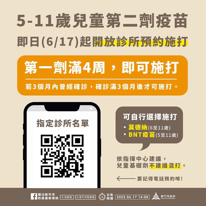 衛生局提醒,若需開站時段外接種,家長自即日起可選擇於合約醫療院所開診時間預約接種疫苗:「5-17歲兒童和青少年輝瑞疫苗」、「6-11歲莫德納」診所(https://reurl.cc/0pnxb6);其它民眾亦可於各廠牌疫苗診所預約(https://reurl.cc/QLD6ko);若有相關疑問,歡迎參考本市防疫資訊網站(https://www.2021.hccg.gov.tw/ )或致電本市居家照護關懷中心03-5320900,將有24小時專人提供諮詢服務。