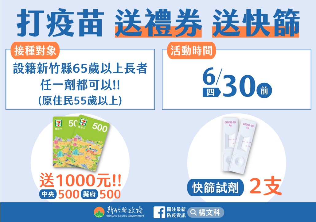 衛生局指出,竹縣65歲以上長者第4劑持續開放接種,只要與第3劑接種時間間隔滿5個月(111年1月17日前有打第3劑者)即可接種第4劑疫苗,呼籲符合資格長者盡速接種。同時也提醒65歲以上(原住民55歲以上)長輩,打疫苗送禮券(設籍竹縣)、送快篩活動已延長到6月30日,請長輩把握時間盡速接種疫苗,同時提升保護力又可拿好禮。