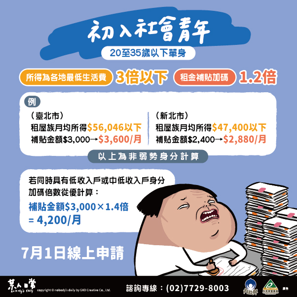 「300億元中央擴大租金補貼專案」再加碼的部分則為,針對初入社會35歲以下青年及社會弱勢,將加碼1.2倍;2年內新婚家庭加碼1.3倍;經濟弱勢家庭(低收入戶及中低收入戶),將加碼1.4倍。此外,育有未成年子女(含胎兒)家庭,1人1.4倍、2人1.6倍、3人1.8倍,每多生1個就多0.2倍。