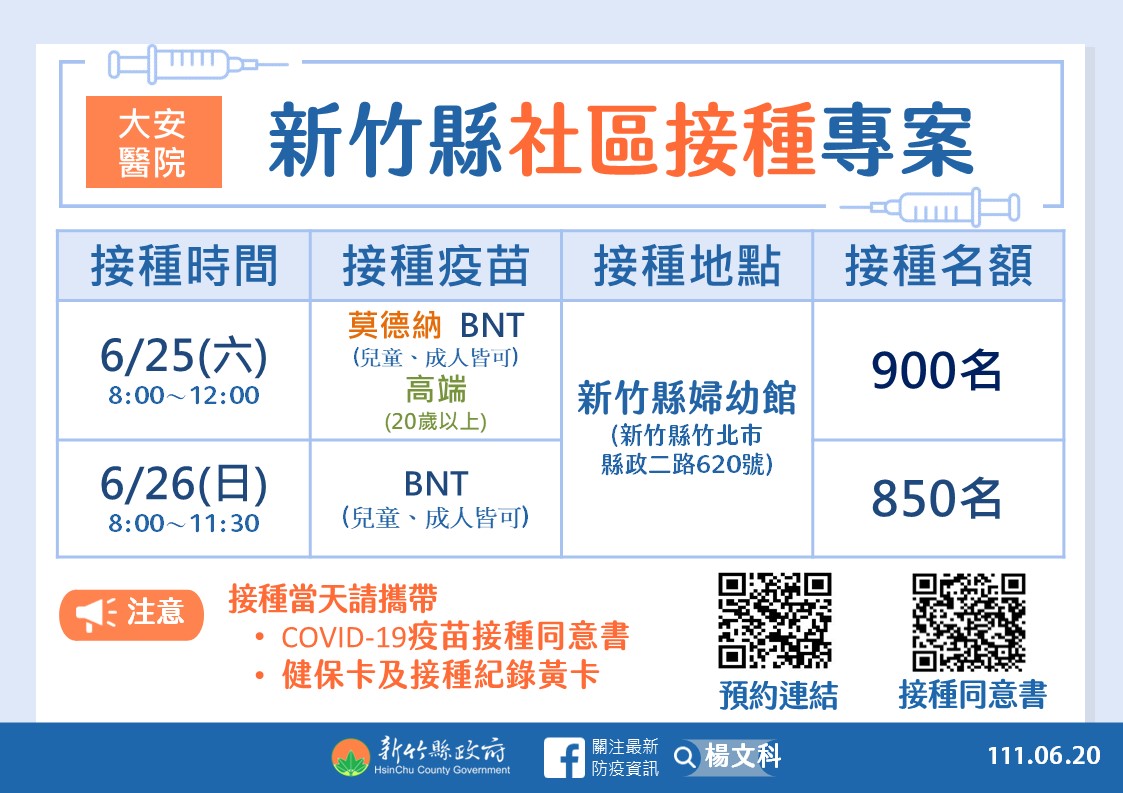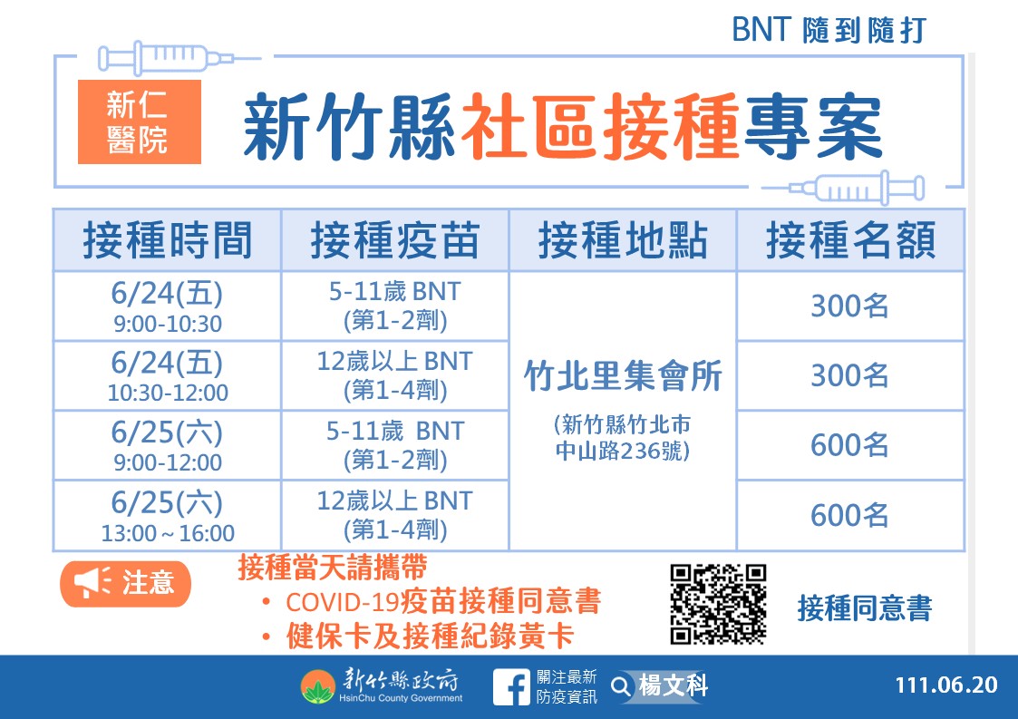 為滿足更多民眾需求,本週五、六、日繼續加開社區接種站,分別在新竹縣婦幼館(週六、日各一場,大安醫院負責,需預約)、竹北里集會所(週五、六共4場,新仁醫院負責,隨到隨打)和關西鎮衛生所(週日2場,新仁醫院負責,隨到隨打)施打,詳細資訊請參考圖卡。婦幼館場次自明(21日)下午2時起開放預約,預約網址:https://survey.rm.com.tw/da/v/index.html