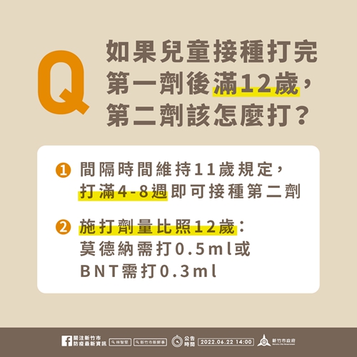 若第2劑接種時間時恰巧滿12歲,依指揮中心建議,接種時間需與第一劑間隔4-8週;施打劑量比照12歲,如莫德納疫苗需接種0.5ml、輝瑞(BNT)疫苗需以成人劑型接種0.3ml。