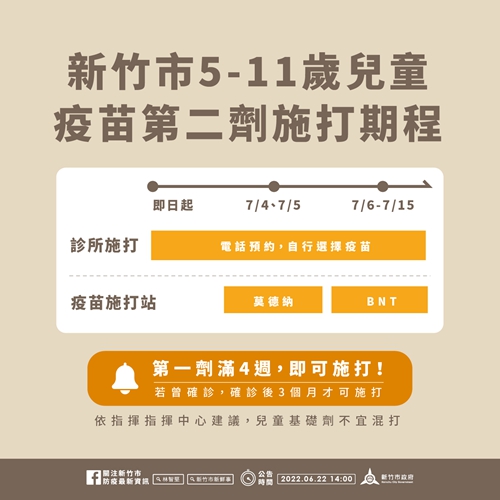 衛生局提醒,5到11歲兒童即日起開放第2劑接種,有需求之家長可向合約診所開診時間電話預約(https://reurl.cc/0pnxb6),市府也將於7月4日至7月15日周一至周五,開設兒童第2劑疫苗專案施打站,其中7月4日至7月5日施打莫德納,7月6日至7月15日施打輝瑞(BNT)。