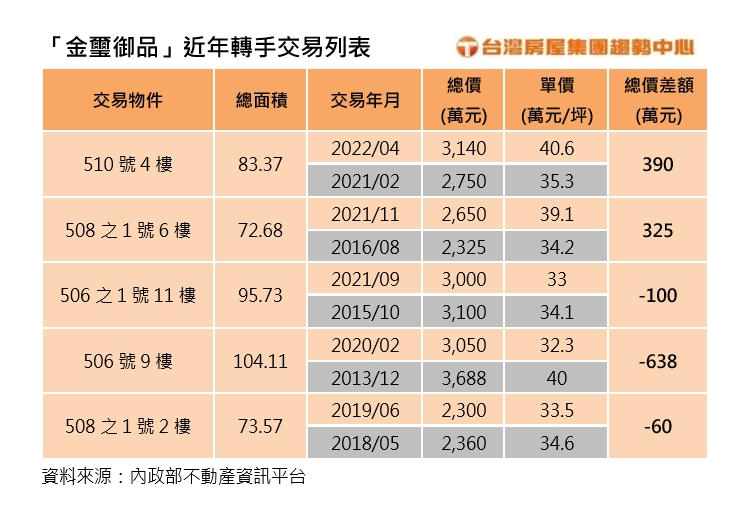 工業宅爭議不斷,觀察全台唯一成功擺脫工業宅轉為一般住宅的社區就是新北市泰山區的金璽御品。實價登錄顯示,金璽御品今年有三筆交易,最新的一筆為四樓,總價3140萬,單價40.6萬,原屋主是2021年以2750萬取得,等於一年左右的時間,身價漲了390萬。觀察近年有歷次交易資料的還有去年交易的六樓戶,2016年2325萬入手,於2021年2650賣出,單價39.1萬,五年間也增值325萬,顯示擺脫「工業宅」標籤後,身價有逐漸「回歸正常」住宅行情。