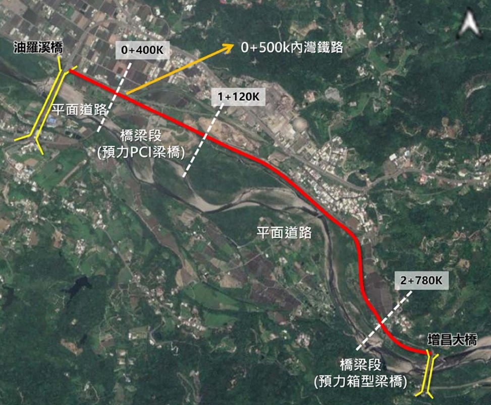 道路工程規畫寬度為15米,兩側各布設一個3.5米車道及2米慢車道,並配置路肩、側溝,另有部分路段因應地形,需要設置護欄。橋梁部分前段靠油羅溪橋的平原段採預力混凝土梁橋,後段因位於山區,採用預力箱型梁橋以克服現況地形限制。
