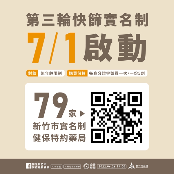 另外,配合指揮中心公告,下周五(7月1日)將啟動第三輪家用快篩實名制,購買模式與第二輪相同,取消單雙號的購買限制,每輪每位民眾僅能購買1次(可代購),1份5劑、每份售價500元,有需要購買之民眾可參考本市快篩實名制藥局地圖( https://reurl.cc/g2N25X )。