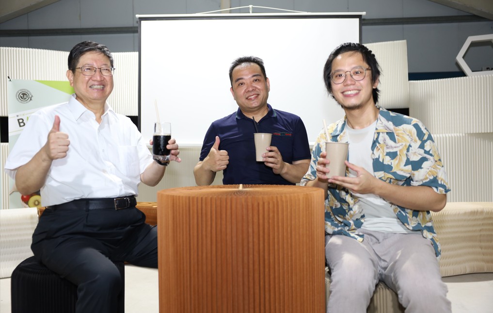 縣長楊文科(左)視察新竹縣在地企業地方創生成果,與全球柑仔店徐惇穎董事長(中)、台芯實業張瑋設計師(右),共同坐在紙家具上,用竹吸管品嘗關西仙草茶。