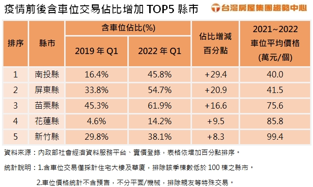 蛋白區買車位的風氣日盛!台灣房屋根據社會經濟資料服務平台資料,比較疫情前後大樓華廈含車位交易棟數的佔比變化,其中南投縣佔比增加最多,今年Q1佔比為45.8%,比2019年Q1的同期16.4%,大增29.4個百分點;第二名為屏東縣,提升20.9個百分點;苗栗縣則居第三,上揚了16.6個百分點;花蓮縣及新竹縣分居四、五名,含車位交易佔比增加最多的前五名,全數由蛋白區縣市拿下。