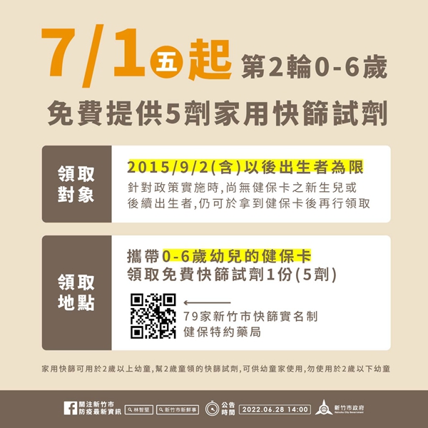 市府表示,目前國內家用快篩試劑數量充足,但因應滿6個月至5歲幼兒疫苗施打作業尚未進行,自7月1日起將實施第2輪學齡前兒童(0至6歲)免費再領取1份5劑快篩試劑,亦提醒尚未領取第1輪免費試劑之家長儘速持幼兒健保卡前往指定通路藥局領取( https://reurl.cc/g2N25X )。
