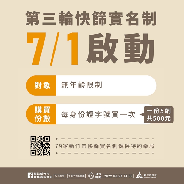 另外,7月1日將啟動第三輪家用快篩實名制,購買模式與第二輪相同,取消單雙號的購買限制,每輪每位民眾僅能購買1次(可代購),1份5劑、每份售價500元,有需要購買之民眾可參考本市快篩實名制藥局地圖。