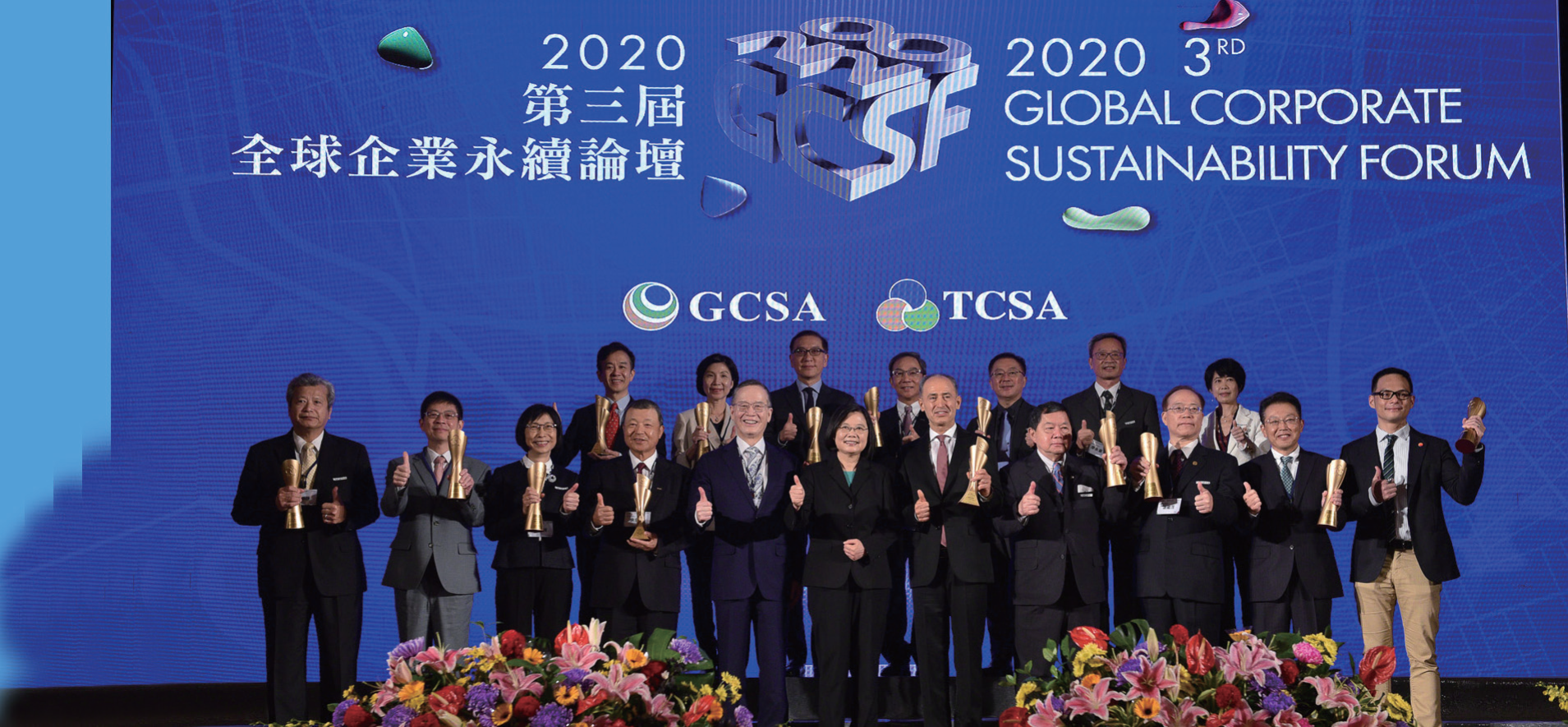 企業愈漸重視永續行動,圖為2020第三屆全球企業永續論壇暨頒獎典禮,主席簡又新(前排左5)、蔡英文總統(中)與獲獎企業受獎代表合影。