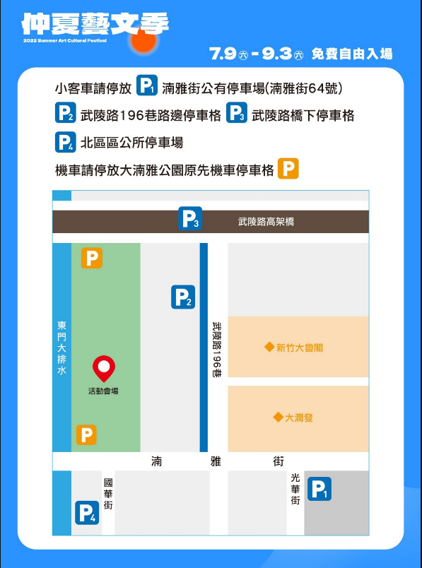 城銷處建議,若民眾自行開車前往,可停放湳雅街公有停車場(湳雅街64號)、武陵路196巷路邊停車格、武陵路橋下停車格、北區區公所停車場等4處;機車則可停放於大湳雅公園機車停車格。
