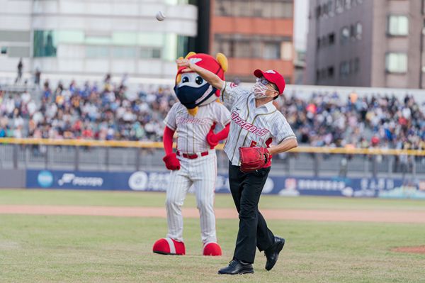 市府指出,新竹市立棒球場投入近12億元原址重建,並與味全龍簽約主場,打造非六都首座擁有職棒球隊的城市,更是竹竹苗唯一符合職棒規格的棒球場,今日迎來整建後歷史性首戰,由新竹女中儀隊帶來精彩開場,在地名將黃清文也送上祝賀影片,接著由身穿「6號」味全龍球衣的陳章賢代理市長進行開球,成為中職開球初體驗,捕手則為味全龍隊長吳東融。