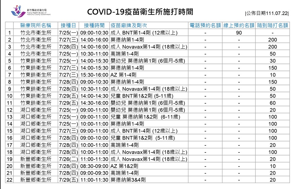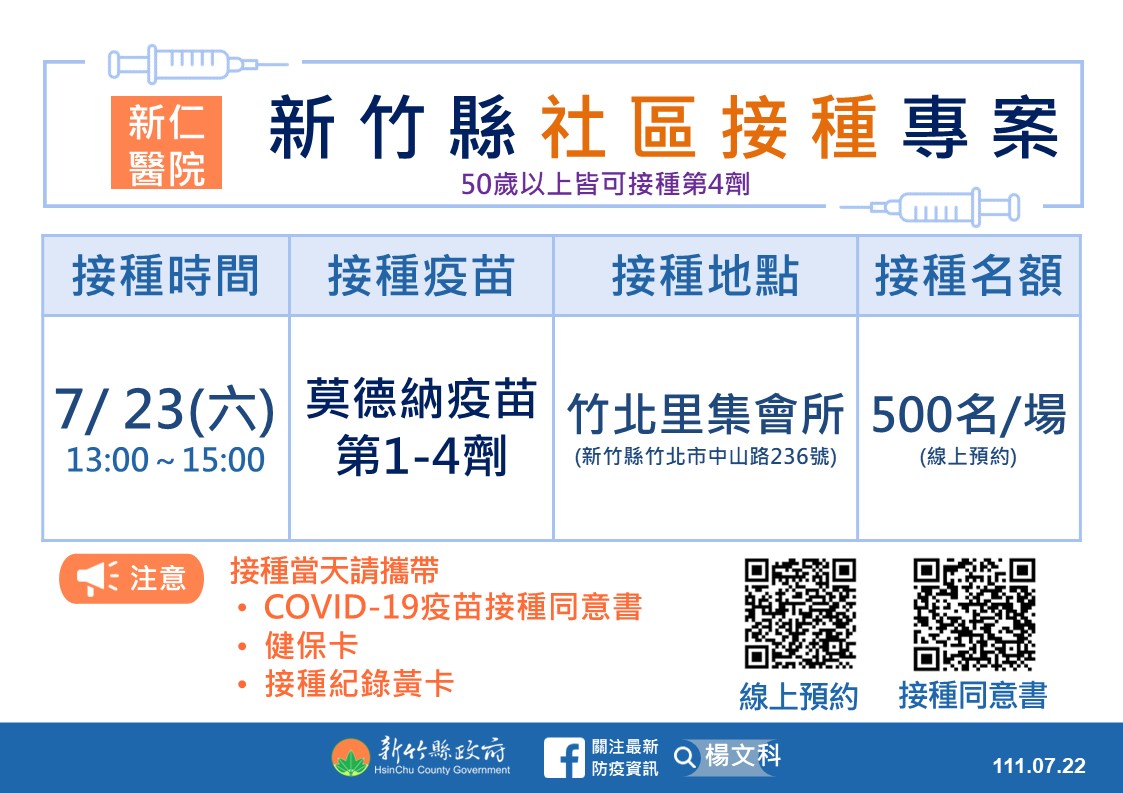 中央宣布今起開放因工作需求需要出國的18歲以上民眾接種COVID-19 疫苗第二次追加劑(第4劑),加上50歲以上民眾也剛剛開放第4劑接種,竹縣衛生局為提供符合資格的民眾更多接種服務,明(23日)週六下午再加開一場竹北里集會所社區接種站,下午1時至3時由新仁醫院醫護提供莫德納疫苗500位名額線上預約,只要符合資格,不限劑次都能來施打。