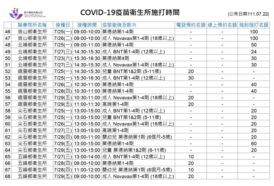 未來一週各衛生所疫苗接種規劃如下: