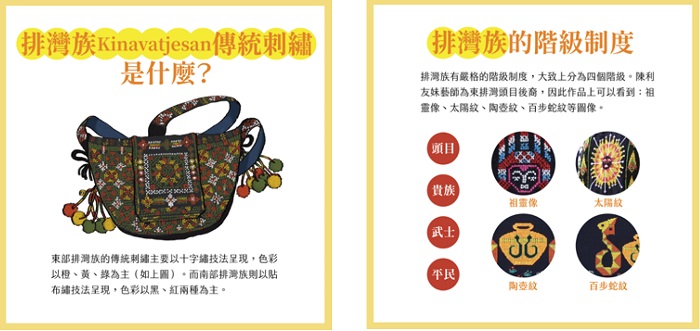 「很久很久以前,太陽神生下兩顆蛋,分別掉入兩個不同的陶甕,並由兩條百步蛇守護、孵化,其中一顆孵出了排灣族的王子,另外一顆則誕生了純潔又美麗的公主」,陳利友妹說明她大幅刺繡作品上的神話傳說。她3歲時即跟隨母親學習刺繡,自幼耳濡目染,也從母親那裡學到部落文化,並持續精進傳統族群文化知識與刺繡技巧,對排灣貴族階級、社會文化及相關紋飾,以及卑南族的文化,都有高度的理解及運用。
