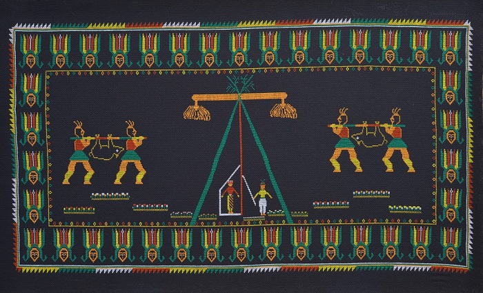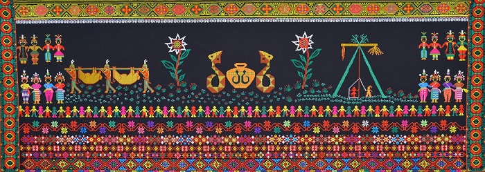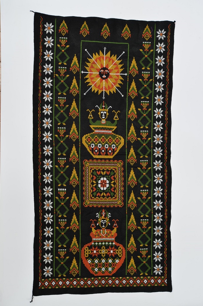 片褲繡紋的刺繡作品《太陽紋‧陶壺‧祖靈‧勇士》