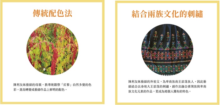 2019年獲臺東縣政府登錄認定為傳統工藝「排灣族(大王部落)傳統刺繡」保存者,2021年更進而成為國家認定的「排灣族Kinavatjesan傳統刺繡」人間國寶,陳利友妹的一針一線都是族群記憶與部落文化的傳承,用美麗刺繡,持續訴說排灣族的故事。