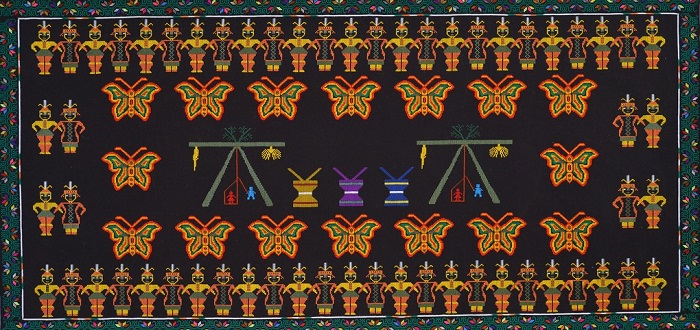 排灣族女性穿著的一片裙。兩邊的圖案是陳利友妹設計的花形圖紋,中間由上至下分別為現代的人形紋、傳統的蝴蝶跟山組合的圖紋,下兩個皆為傳統的人形紋。