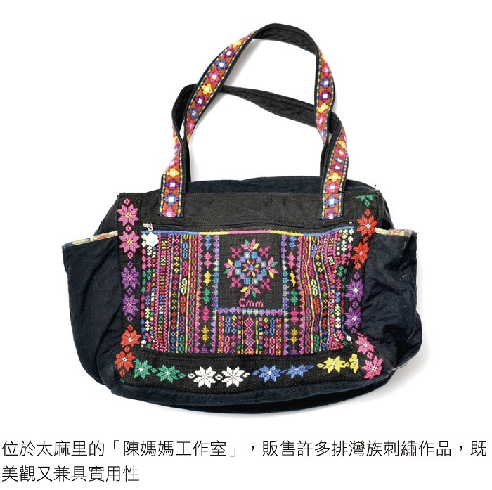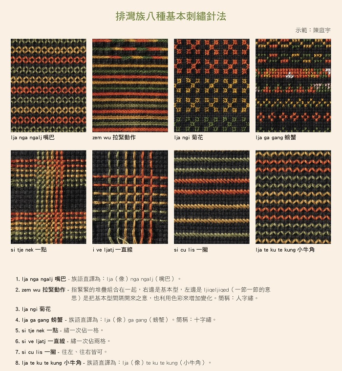 她說,排灣族常見的刺繡針法有八種,包括sitjenek一點繡、siveljatj一線繡、siculis一撇繡、ljatekutekung小牛角、ljangangalj嘴巴繡(簡稱「口繡)、zemwu拉緊動作(簡稱「人字繡」)、ljangi菊花繡、lja ga gang螃蟹繡(簡稱「十字繡」),「這八種技法有非常多的變化,學會後就可以靈活運用在繡布上,甚至發揮個人的創意,作出各式各樣的排灣族特色作品」。