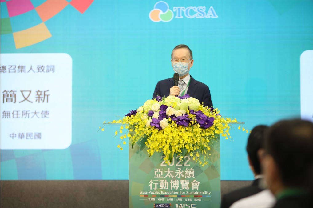 「2022亞太永續行動博覽會」於8月12日(星期五)上午以實體與線上方式隆重舉行開幕典禮,本活動由台灣永續能源研究基金會董事長簡又新大使致詞及引言。簡又新大使表示,2022年3月底,國發會公布我國的淨零排放路徑及策略,今年TAISE所有活動主題聚焦淨零行動的落實與實踐,本次一連三天的活動,全臺產官學研130個單位永續行動重磅登場,代表各界有心展現各自的永續成果,期許可以為永續發展盡一份心力,大家熱烈的參與行動令人感佩,絕對是臺灣永續行動史上最重要的一步,同時期許在會展活動中激起更多合作與商機,將臺灣的永續行動成果展現至全世界。