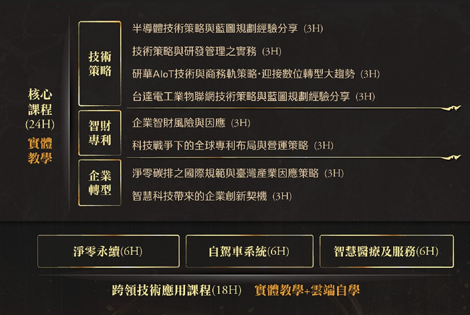 本次課程規畫技術策略、智財專利、企業轉型等核心課程,由產學研跨領域專家們分享自身經驗,包含智慧科技帶來的企業創新契機、技術策略與研發管理實務、研華AIoT技術與商務雙軌策略、台達電工業物聯網技術策略與藍圖規劃經驗分享、企業智財風險與因應、半導體技術策略與藍圖規劃經驗分享、淨零碳排之國際規範與臺灣產業因應策略、及科技戰爭下的全球專利布局與營運策略。同時,課程更提供產業關注的重點趨勢剖析,如淨零永續、自駕車系統及智慧醫療與服務等,並安排學員參訪自駕車平台、TIBIC生醫產業跨域整合實驗場域、沙崙綠能科技示範場域等,實際了解跨領域技術整合應用的成果。