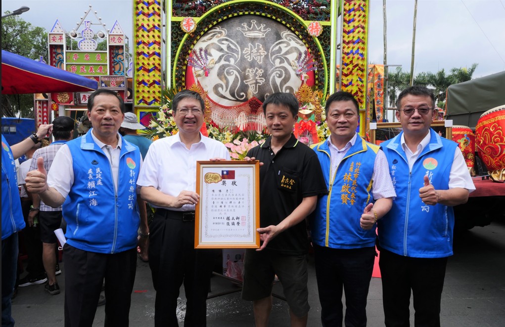 楊縣長和貴賓頒獎表揚神豬、神羊特等獎得主陳博彥、蔡錦堂,並一一與廟前廣場展示大豬、神羊的飼主合影,現場有八音、客家戲曲、舞獅表演,吸引大批民眾前來觀賞,搶著和大神豬合影,現場熱鬧滾滾。