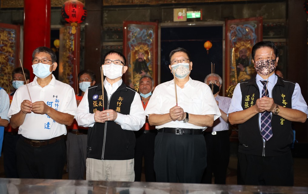 縣長楊文科(右二)與議長張鎮榮(左二)在戲劇開場前參拜三元宮
