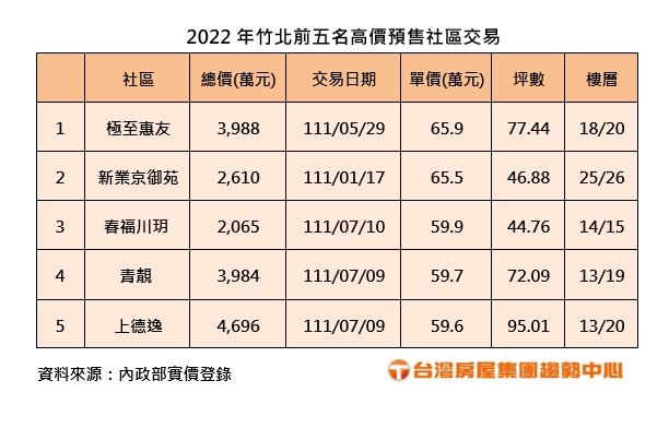 觀察竹北實價登錄,排除一樓交易,今年最高價的預售案為興隆路上的水岸宅「極至惠友」,18樓賣出65.9萬的單價,位於縣政府公園第一排的景觀宅「新業京御苑」,25樓也賣出65.5萬的高價,顯示竹北精華區的新案幾乎都坐穩五字頭,高樓層也有六字頭的身價。