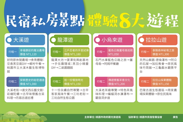 住宿,是旅遊重要的環節,民宿更是體驗在地生活的最佳方式,為鼓勵民眾入住桃園民宿深刻感受桃園文化風情,桃園市政府觀光旅遊局特別推出「住桃宿帶你遊」活動,以四大民宿聚落(拉拉山、小烏來、大溪、龍潭區)為核心,開發八大特色行程,自8/27入住全市合作民宿,就可以免費參加,方案內容包括車資、餐食、體驗等,市價千元以上,限額1,500名額,先住先贏,額滿為止。