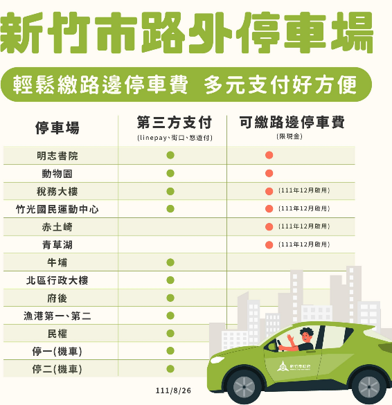 新竹市政府投入1.13億推動「停車場再生計畫」,從105年11月起至107年10月底陸續完成東大、府後等9座停車場的改造,111年持續更新停車場環境,提供民眾更優質的停車服務。代理市長陳章賢表示,為讓民眾更方便停車、簡單繳費,9月1日起本市明志書院停車場及動物園停車場繳費機提供路邊停車繳費功能,11處立體、地下停車場停車費也開放掃碼使用第三方支付,讓民眾繳費有更多選擇。