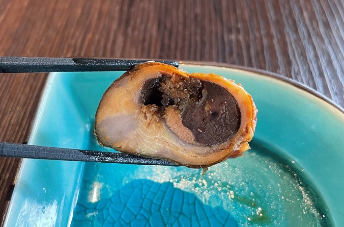 經過總主廚秘製滷汁熬煮6小時的香魚甘露煮,滷後的骨頭全都化掉,整隻都可吃,風味絕佳。