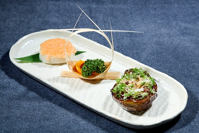 雙拼茄子田樂燒‧明太子山藥,簡單的食材,經過總主廚以精心調製的醬汁烹調後,化身成另一種令人驚豔的味道,連中間擺飾的小開胃菜,也讓人好奇是何食材。