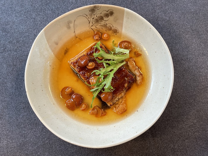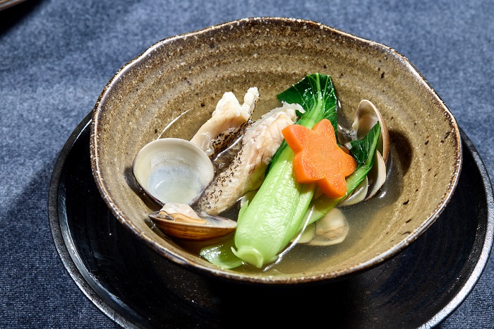 柚子石斑魚貝湯,將昆布於柴魚高湯中浸泡入味,再以此特製高湯蒸石斑魚,蒸煮好的湯頭,清爽中自帶鮮美,是相當高級的口感。