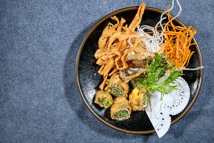 季節香魚唐揚,純手工製作的香魚肉作成內餡,捲進蘆荀、海苔、日本大葉,口味獨特,連香魚骨頭也炸得酥酥脆脆,完全不浪費食材。